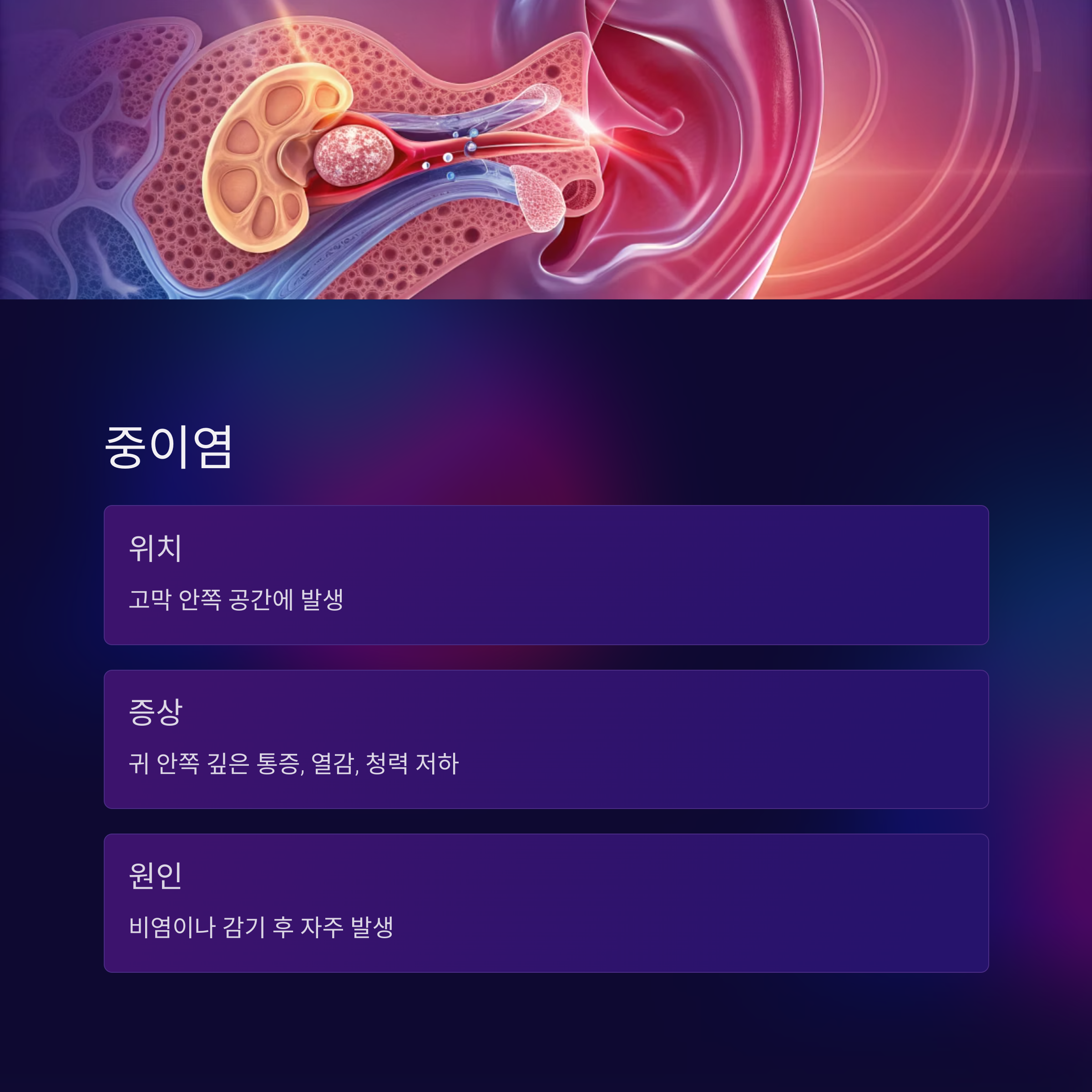 중이는 고막 안쪽에 위치한 공간으로, 이 부위에 염증이 생기면 귀 안쪽 깊은 통증을 유발합니다. 아이들에게 흔한 질환이지만 성인에게도 나타날 수 있으며, 열감이나 청력 저하를 동반하기도 합니다. 비염이나 감기를 앓은 후 중이염이 발생하는 경우가 많습니다.