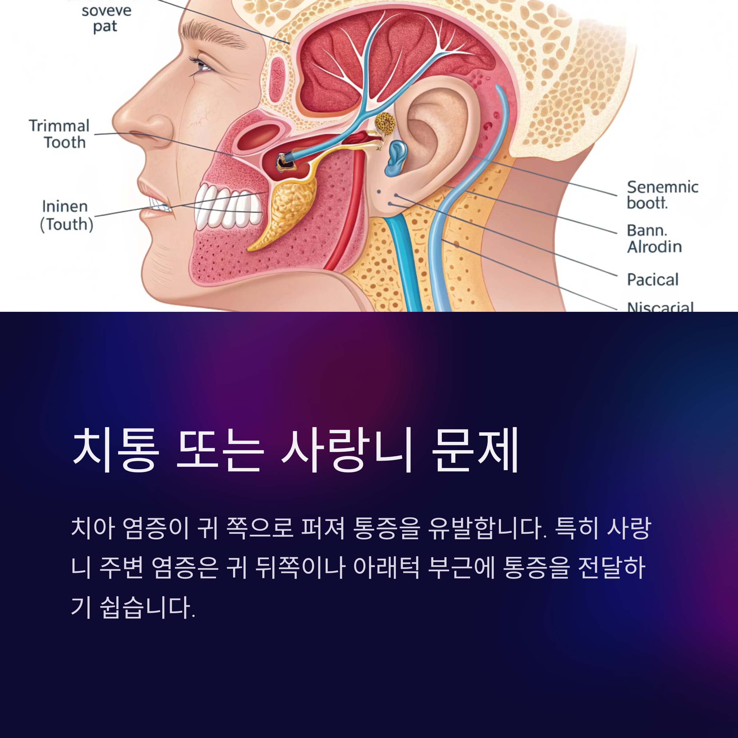 치아에 염증이 생기면 해당 신경이 귀 쪽으로 퍼져 통증을 유발할 수 있습니다. 특히 사랑니 주변의 염증은 귀 뒤쪽이나 아래턱 부근에 통증을 전달하기 쉬우며, 이로 인해 귀가 아프다고 착각할 수 있습니다.
