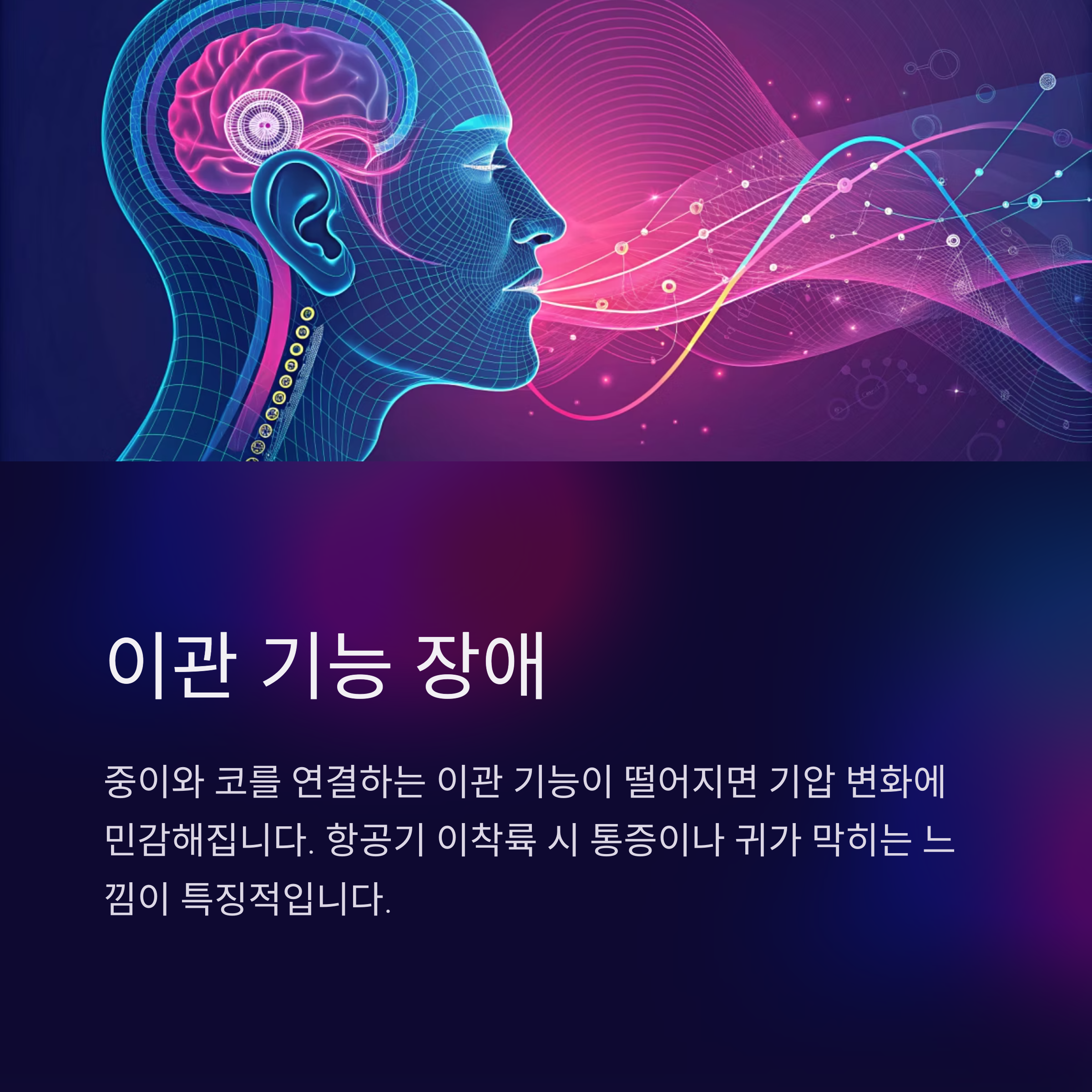 중이와 코를 연결하는 이관의 기능이 떨어지면 외부 기압 변화에 귀가 민감하게 반응하며 통증을 느낄 수 있습니다. 항공기 이착륙 시 통증을 자주 느끼거나 귀가 막히는 듯한 느낌이 드는 경우, 이관 기능 장애를 의심할 수 있습니다. 알레르기성 비염이나 감기에 자주 동반됩니다.