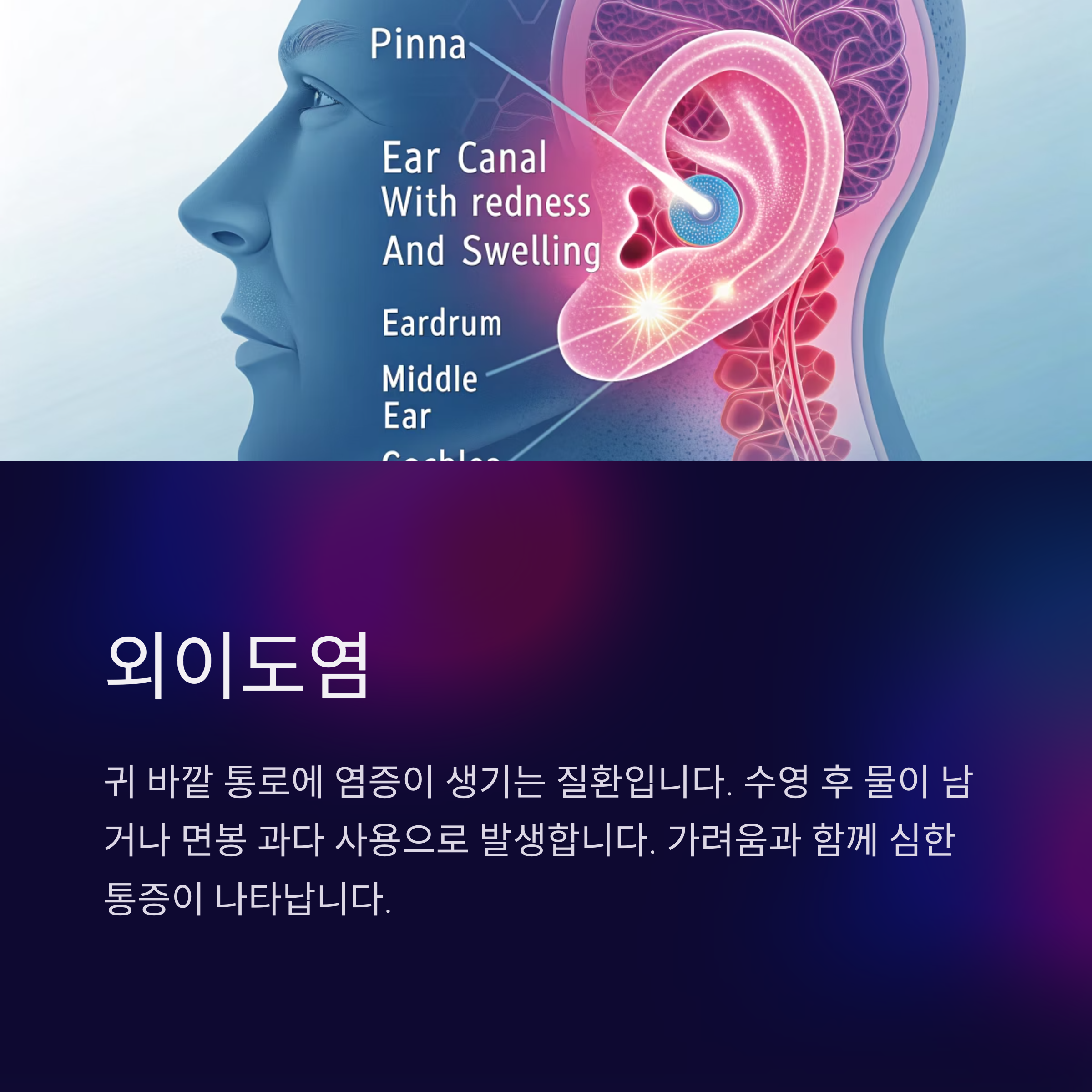 귀 바깥 통로에 해당하는 외이도에 염증이 생기는 외이도염은 대표적인 귀통증 원인입니다. 수영 후 귀에 물이 남아 있거나, 면봉이나 귀이개를 과도하게 사용할 때 세균에 감염되어 통증이 발생합니다. 가려움과 함께 통증이 심해질 수 있으며, 방치하면 중이까지 확산될 수 있습니다.