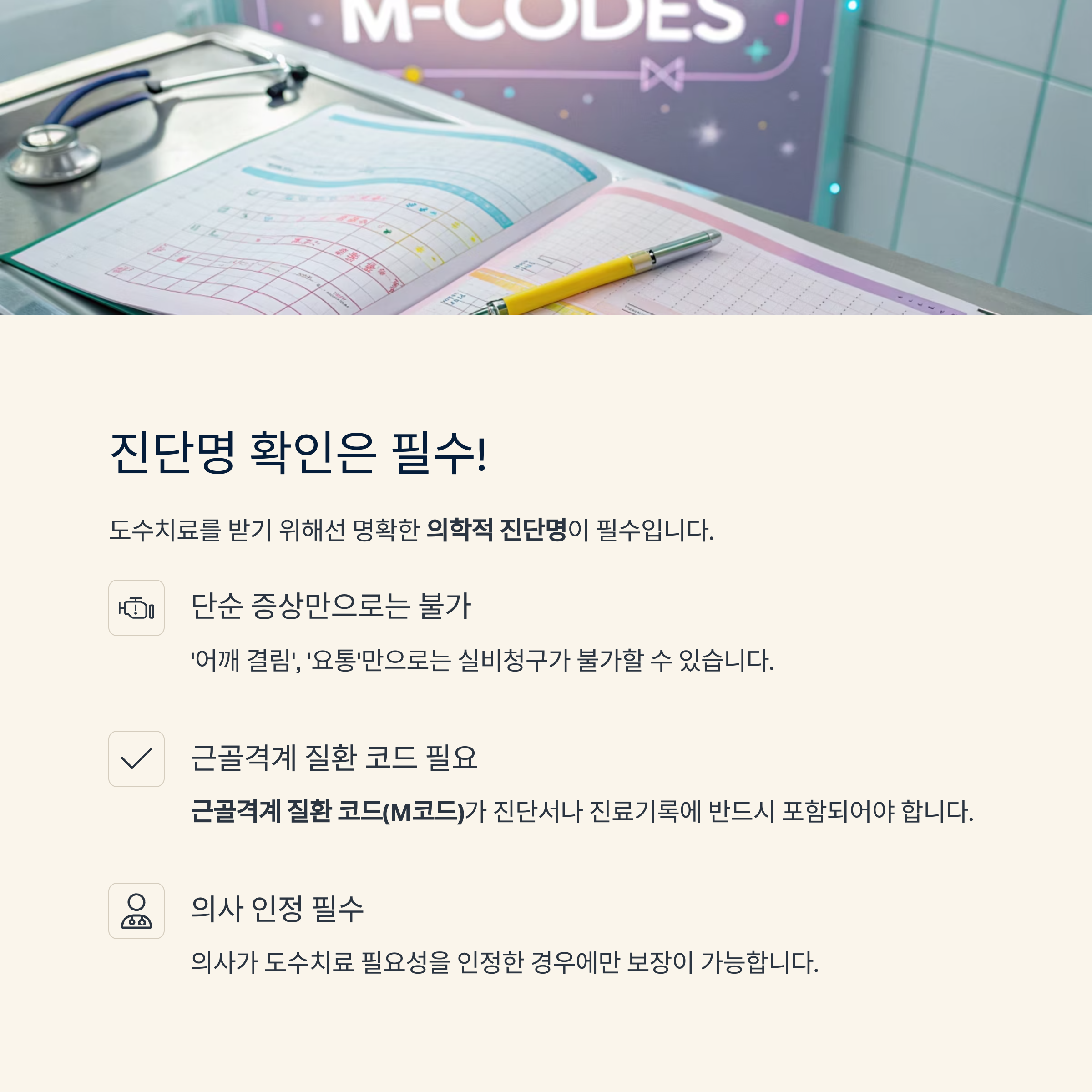 **근골격계 질환 코드(M코드)**가 진단서나 진료기록에 반드시 포함되어야 합니다.