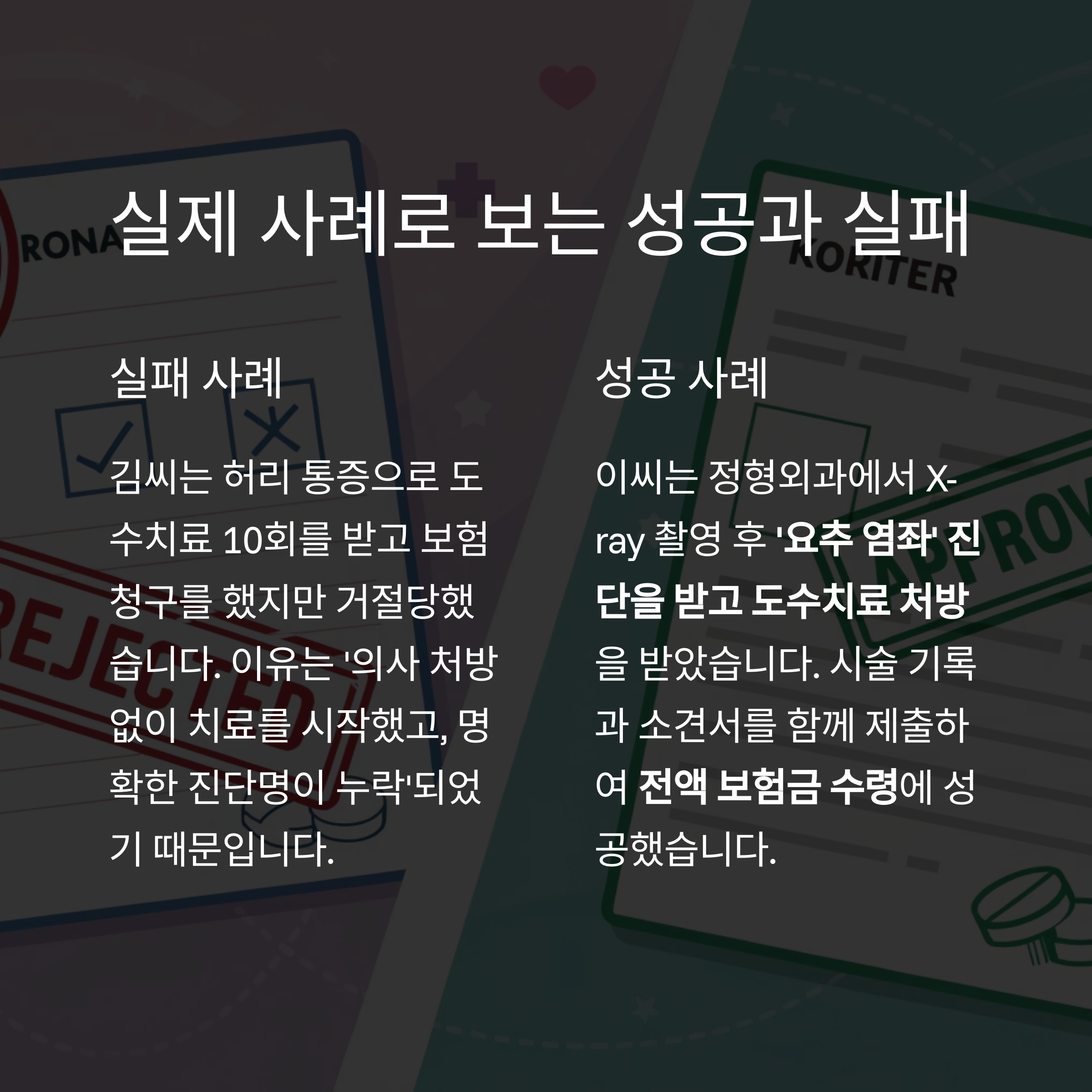 이유는 '의사 처방 없이 치료를 시작했고, 명확한 진단명이 누락'되었기 때문입니다. - 반대로 이씨는 정형외과에서 X-ray 촬영 후 '요추 염좌' 진단을 받고 도수치료 처방을 받았습니다.