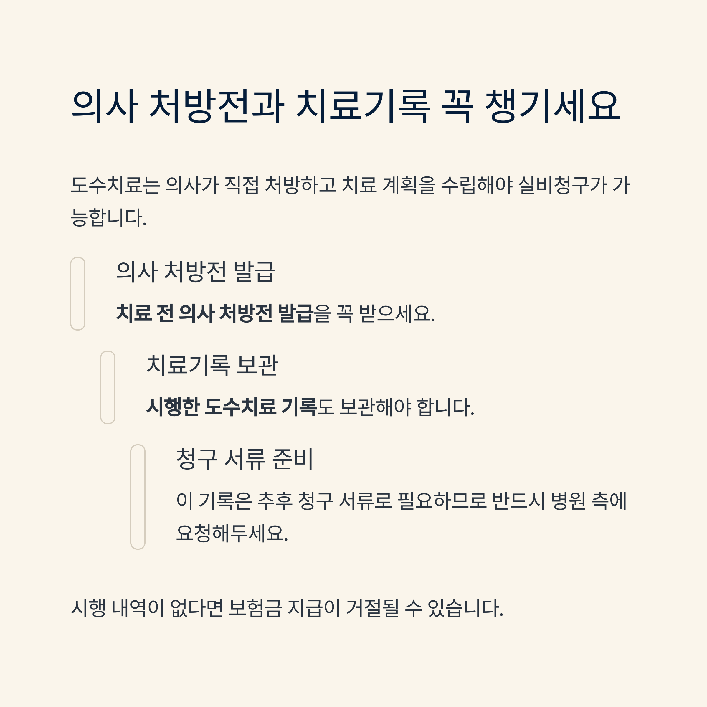 치료 전 의사 처방전 발급을 꼭 받고, 시행한 도수치료 기록도 보관해야 합니다.