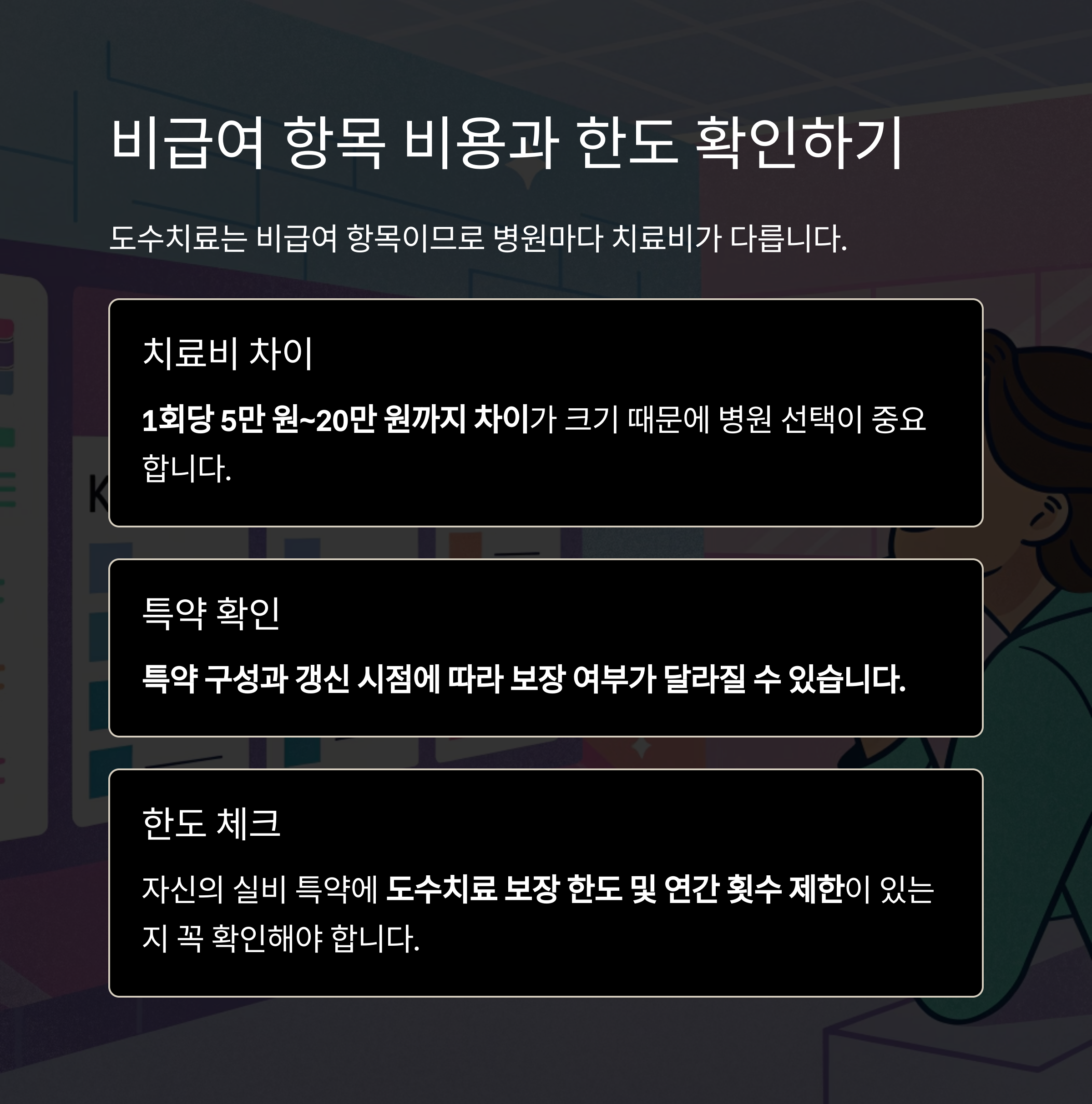 또한 실비보험은 특약 구성과 갱신 시점에 따라 보장 여부가 달라질 수 있습니다.