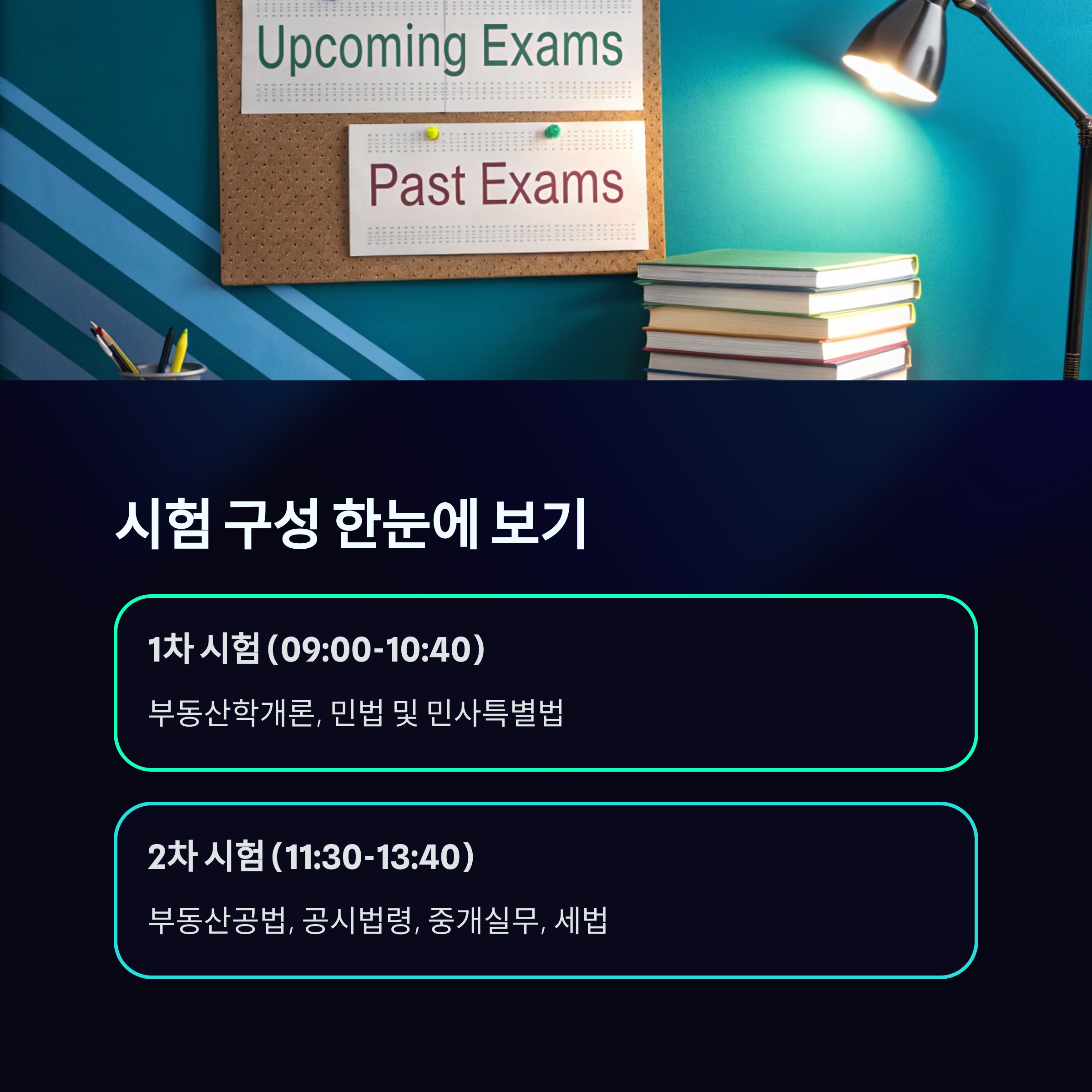 | 2차 시험 | 11:30~13:40 | 부동산공법, 공시법령, 중개실무, 세법 |